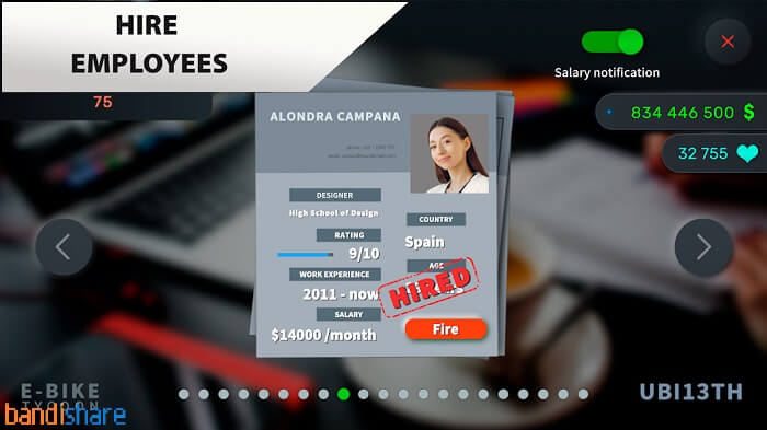 Công việc kinh doanh trong E-Bike Tycoon: Business Empire đang vận hành và phát triển tốt, bạn phải tuyển và thuê thêm nhân viên hỗ trợ. Game sẽ cho bạn cơ hội tiếp cận với nhiều hồ sơ ứng viên, bạn nên tuyển chọn người phù hợp với từng vị trí làm việc tại công ty của mình.