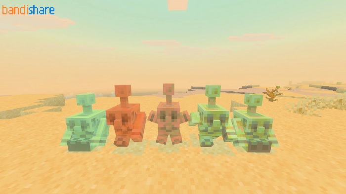 Trong bản thử nghiệm Minecraft 1.21.120.24 APK, Copper Golems chính là một mob thân thiện, nó được coi như người hỗ trợ hữu ích cho nhân vật. Nhà phát hành tiếp tục cải tiến tính năng biến thành tượng Golem Statues của Copper Golems. Khi hiện tượng oxy hóa đạt mức độ cực đại, mob Copper Golems sẽ không còn khả năng di chuyển mà chúng đứng im. Bạn hãy mang những bức tượng Golem Statues làm món đồ trang trí cho không gian nhé. Người chơi không cần tìm kiếm mob này mà có thể tự tạo bằng khối đồng với bí ngô khắc.