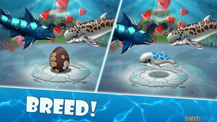 Ngoài mở khóa cá mập mới trong Shark Mania, game còn cho phép bạn lai tạo nên những giống cá mập mới. Loài mới được lai tạo sẽ sở hữu sức mạnh vượt trội từ 2 loài bố mẹ ban đầu nên khả năng chiến đấu tốt hơn. Bạn có thể tạo ra cá mập đầu búa, cá mập huyền thoại Megalodon và nhiều giống cá mập độc đáo khác. Bạn hãy tạo nên đội quân cá mập độc nhất vô nhị, từng bước đánh bại đối thủ, chinh phục mọi vùng biển bí ẩn và nguy hiểm trong trò chơi nhé!