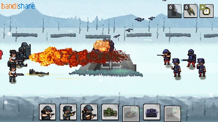 Bên cạnh đó, game còn có rất nhiều loại vũ khí mạnh mẽ để bạn trang bị cho quân đội của mình. Bạn có thể sử dụng vũ khí như: Bom, khí gas, bẫy mìn, tên lửa, pháo binh, súng phóng lửa, súng ngắn, súng máy,… Thay đổi vũ khí sẽ giúp sức mạnh quân đội được tăng lên, nhờ vậy mà bạn tiêu diệt kẻ thù cũng dễ dàng hơn.